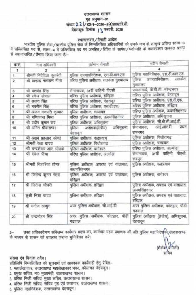 इसी क्रम में पुलिस विभाग में प्रशासनिक स्तर पर आवश्यक तबादले किए गए हैं। माना जा रहा है कि यह कदम पुलिस तंत्र को अधिक जवाबदेह और परिणामोन्मुख बनाने के उद्देश्य से उठाया गया है।
